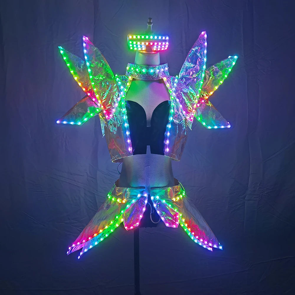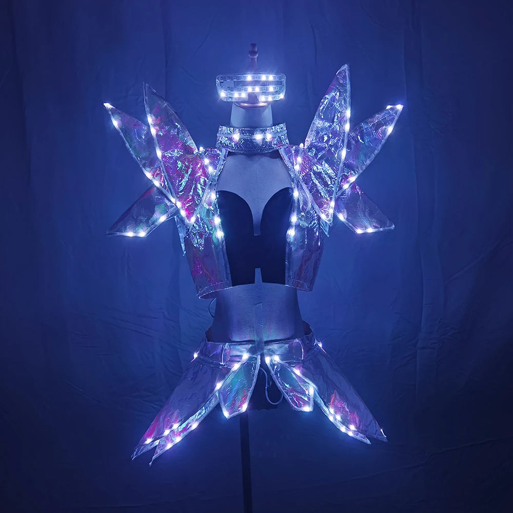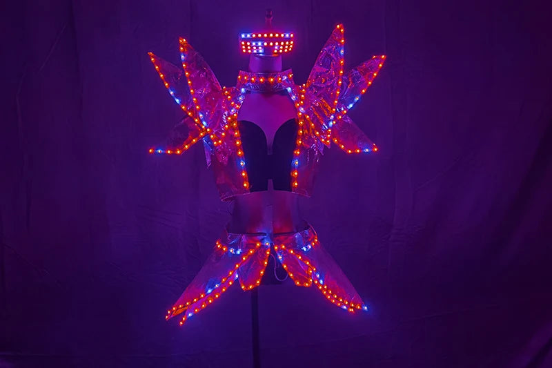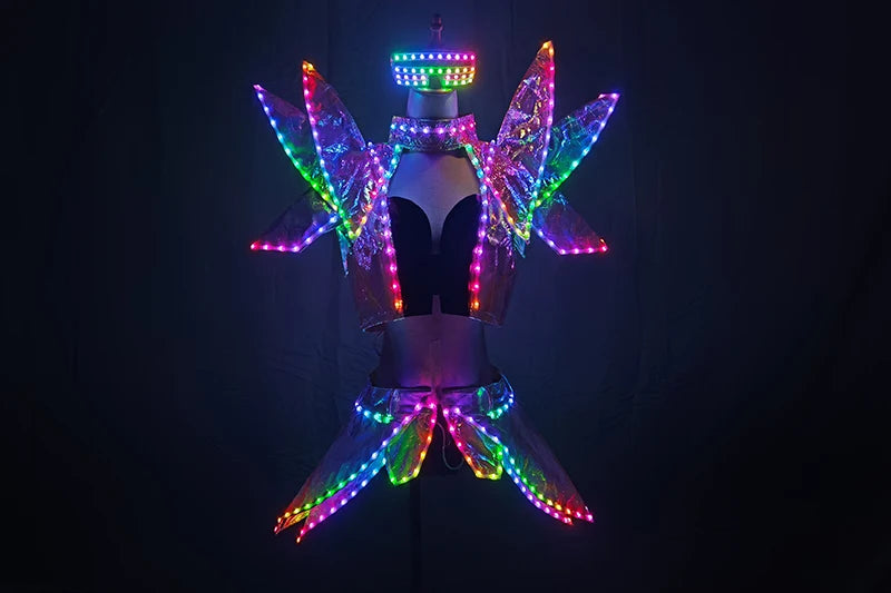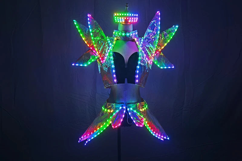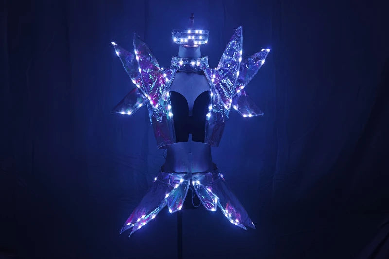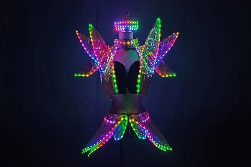 Dieses futuristische Rave-Outfit- bringt Bewegung ins Dunkel. Mit integrierter Lichttechnik, mehrfarbiger Beleuchtung und markanten Schulter-Elementen wirst du zum Highlight auf jedem Festival. Ob bei Techno, Trance oder Tribal – dein Look sticht heraus, bevor du überhaupt tanzt.✨👣